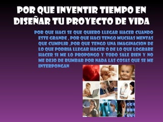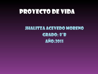 Este documento presenta el proyecto de vida de Jhalitza Acevedo Moreno de 8° grado. Ella desea estudiar, salir adelante con sus planes, no arrepentirse de sus decisiones y no rendirse. Se valora a sí misma y piensa que es buena persona que comparte con sus amigos. Sus fortalezas incluyen ser amigable, cariñosa y respetuosa, mientras que necesita mejorar en pensar antes de actuar. Tiene una buena relación con su familia y amigos. Sus metas a corto y largo plazo incluy