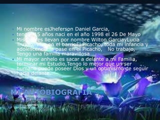 Jheferson Daniel Garcia tiene 15 años y vive en el barrio El Picacho con sus padres Wilton Garcia y Lucia Trujillo. Su mayor anhelo es sacar adelante a su familia, terminar sus estudios y tener su propia empresa. A largo plazo, sus metas son terminar sus estudios, montar su propia empresa y alcanzar estabilidad económica para su familia en 5 años. Para lograrlo, continuará estudiando con dedicación y proyectando desde ahora todo lo relacionado con los negocios.