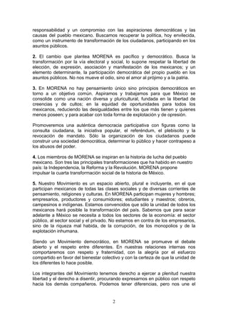 El documento presenta los 10 principios éticos y valores que rigen la conducta de los miembros de MORENA. Estos incluyen concebir la política como servicio al pueblo, buscar la transformación de México de forma pacífica y democrática a través de la participación ciudadana, y luchar contra la corrupción, desigualdad y opresión para construir una nación más justa y libre.