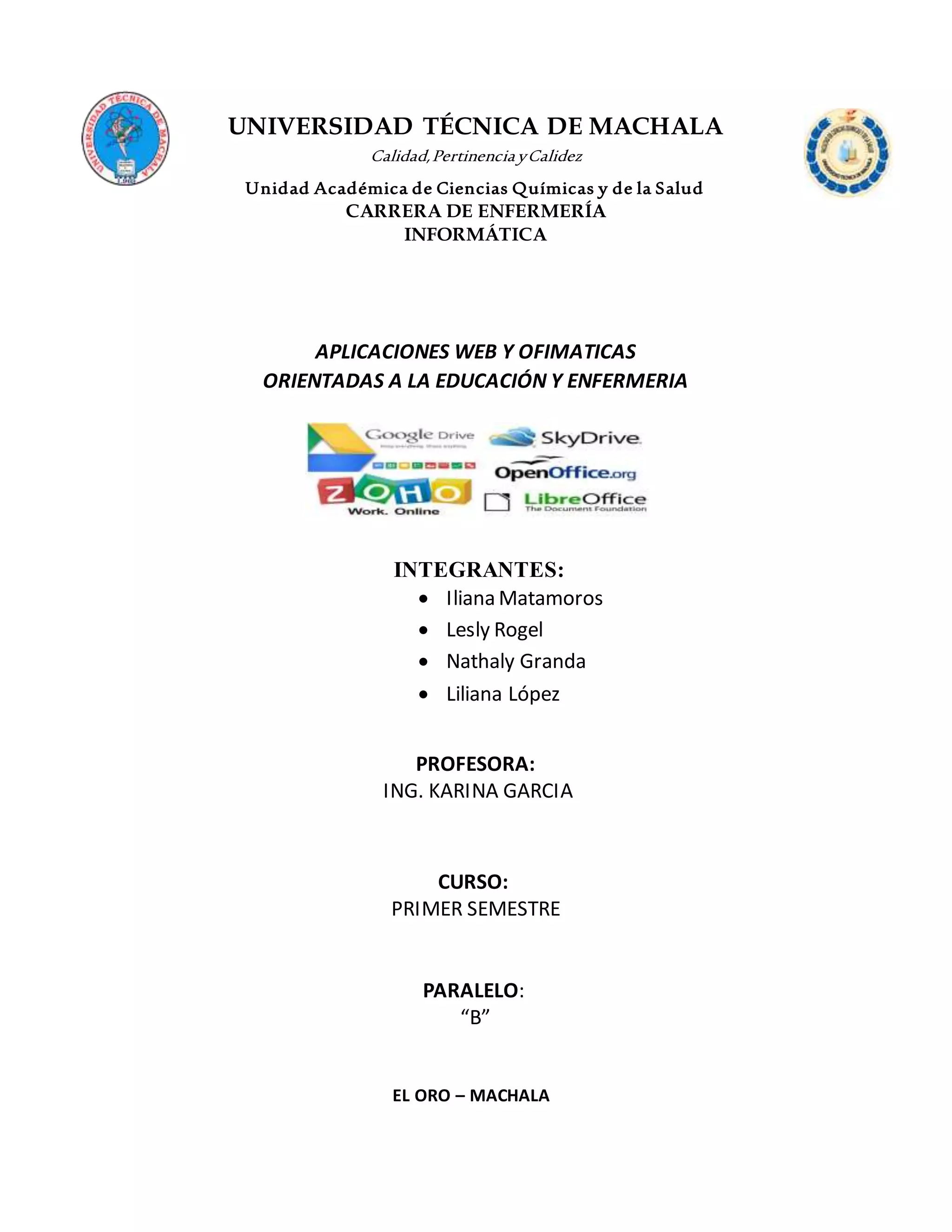 El proyecto de la Universidad Técnica de Machala explora la utilidad de herramientas web y ofimáticas en la educación y la carrera de enfermería, destacando su importancia en el manejo de información y pacientes. Se analizan varias aplicaciones, como Google Drive, Dropbox, y Gmail, que optimizan la gestión del trabajo académico y profesional. El informe concluye que estas herramientas son clave para mejorar la calidad educativa y la eficiencia en la práctica enfermera.