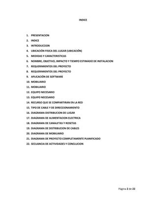 Este documento presenta el diseño de una red local (LAN) para un ciber con 15 computadoras en Villagrán, Gto. Incluye la ubicación, medidas del espacio, equipamiento requerido como computadoras, cableado, accesorios de red e impresoras. También detalla los diagramas de distribución eléctrica, cableado, mobiliario y la red completa, así como los costos y actividades de instalación requeridos.