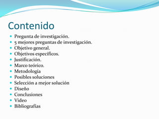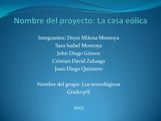 Este documento presenta un proyecto de investigación sobre cómo obtener electricidad para viviendas mediante energía eólica. El grupo estudiantil "Los tecnológicos" explorará esta pregunta a través de objetivos como mostrar energías alternativas que no contaminan y demostrar que la energía eólica puede usarse a nivel mundial de manera accesible. El marco teórico describe la energía eólica y cómo funcionan los molinos de viento. La metodología incluirá investigaciones e intentos de construir un prototipo a escala.