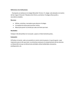 El proyecto busca celebrar el Día del Profesor en la escuela Monseñor Terrero a través de juegos y actividades compartidas entre profesores y alumnos, con el objetivo de fomentar la convivencia y reconocer la labor docente. Los estudiantes organizarán juegos, decorarán la escuela y proveerán comida para compartir en familia. Al finalizar, evaluarán su experiencia para mejorar futuras celebraciones.