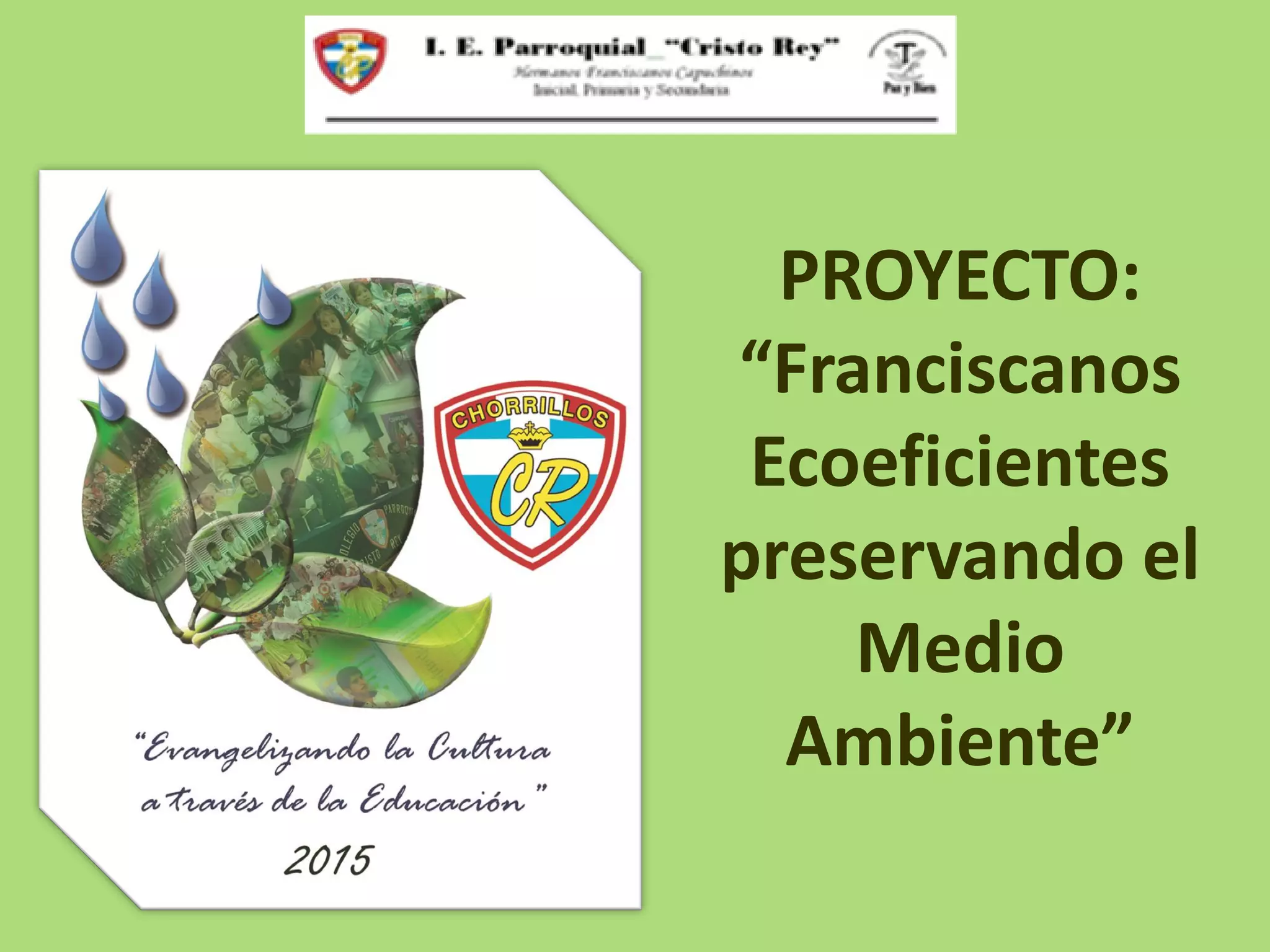 El documento presenta un proyecto para promover prácticas ecoeficientes en la comunidad educativa Cristo Rey. El objetivo general es concientizar sobre el manejo responsable del agua, energía, residuos sólidos y alimentación saludable. Los objetivos específicos incluyen disminuir el consumo de agua y energía, aumentar el número de estudiantes con lonchera saludable y reciclar residuos. Se detallan las actividades de gestión institucional y pedagógica para alcanzar dichos objetivos.