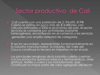 El documento resume la economía de Cali, Colombia. Explica que la ciudad tiene una población de 2.1 millones de personas y un PIB de $14 billones. El sector servicios y la industria manufacturera son importantes para la economía local. La industria de Cali se especializa en productos químicos, textiles, impresión y cuero. Las cámaras de comercio juegan un papel clave en el desarrollo regional según una encuesta a empresas.