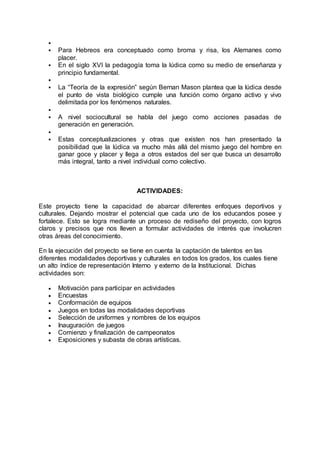 Este documento presenta un proyecto de tiempo libre con los siguientes objetivos: integrar a la comunidad educativa mediante actividades de tiempo libre, vincular a estudiantes a través de su participación, crear espacios para la expresión de habilidades, y motivar el uso adecuado del tiempo libre. El proyecto busca involucrar a estudiantes en actividades deportivas, artísticas y culturales durante su tiempo libre para descubrir talentos y desarrollarse de manera integral.