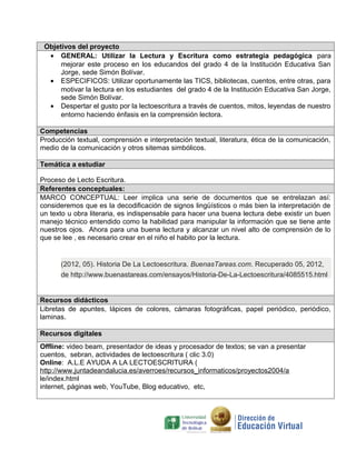 Este proyecto busca mejorar el proceso de lectoescritura en estudiantes de 4to grado a través del uso de las TIC durante 3 meses. Se utilizarán actividades como encuentros literarios, prácticas de lectura y escritura con recursos digitales y un cuaderno viajero. El proyecto será evaluado mediante pruebas orales y escritas para medir la comprensión lectora y habilidades de escritura de los estudiantes.