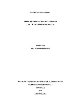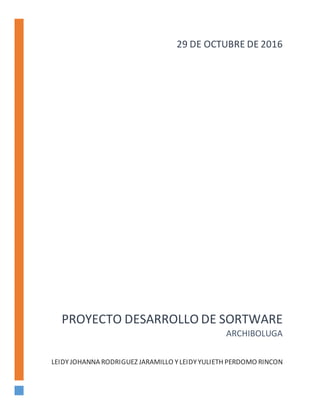 Este documento presenta el proyecto de desarrollo de una aplicación web para el área de archivo de la arrocera Boluga. El objetivo es diseñar e implementar un sistema que permita realizar el registro y consulta del archivo histórico de manera digital para agilizar los procesos y proteger la documentación. El proyecto utilizará la metodología RUP y contará con módulos para el ingreso, almacenamiento y visualización de la información de empresas, estantes, niveles, cajas, carpetas, folios y préstamos.