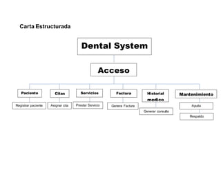 El documento presenta un proyecto de sistema de información para una clínica dental desarrollado por un grupo de estudiantes. Incluye una lista de integrantes del proyecto, una carta estructurada con las funciones del sistema, un diagrama de flujo y un modelo entidad-relación para describir la base de datos requerida. El sistema permitirá registrar pacientes, asignar citas, prestar servicios, generar facturas, llevar un historial médico y realizar tareas de mantenimiento y respaldo.
