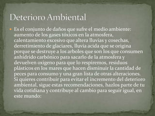 El documento habla sobre el deterioro ambiental y ofrece recomendaciones para evitarlo. Describe los daños al medio ambiente como aumento de gases tóxicos, calentamiento global, derretimiento de glaciares y residuos plásticos en los mares. Luego recomienda acciones como usar focos ahorradores de energía, revisar la presión de llantas para ahorrar gasolina, reciclar papel, apagar aparatos electrónicos y usarlos a máxima capacidad, sembrar árboles, y consumir comida orgán