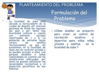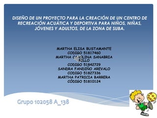 Este documento propone el diseño de un proyecto para crear un centro de recreación acuática y deportiva para personas de todos los estratos sociales en Suba. El proyecto busca mejorar la calidad de vida de la comunidad a través de la recreación y el deporte. Se realizaron estudios de mercado, técnicos y financieros para determinar la viabilidad y rentabilidad del proyecto. El centro contaría con piscinas, canchas deportivas y áreas verdes en un terreno de 30 hectáreas con fácil acceso.