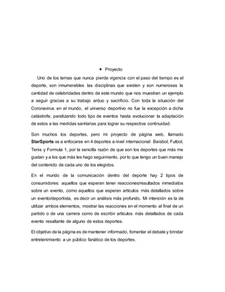 El documento presenta un proyecto para crear un sitio web llamado StarSports que brindará información sobre 4 deportes: béisbol, fútbol, tenis y Fórmula 1. El sitio ofrecerá resultados e información actualizada, así como análisis detallados de eventos y deportistas. El objetivo es mantener informados y entretener a fanáticos de los deportes. Se explica el plan de negocio incluyendo un análisis de necesidades, presupuesto y esquema cualitativo para el lanzamiento y operación exitosa del