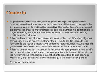 Este documento propone utilizar las tecnologías de la información y la comunicación (TIC) para mejorar el aprendizaje de matemáticas en el grado sexto de una escuela. Actualmente, los estudiantes tienen dificultades con conceptos básicos como suma, resta, multiplicación y división. El proyecto busca hacer las lecciones más interactivas y didácticas a través de herramientas digitales para aumentar el interés y el rendimiento de los estudiantes.