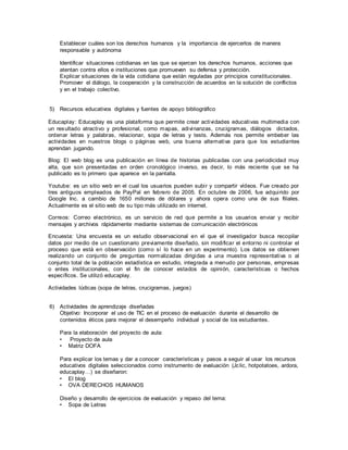 Este documento presenta el portafolio de un diplomado sobre la apropiación pedagógica de las TIC. El portafolio describe las actividades diseñadas por una docente para enseñar derechos humanos a estudiantes de cuarto grado utilizando recursos digitales. Estas actividades incluyen el desarrollo de un blog, vídeos, encuestas, sopas de letras y crucigramas con el objetivo de mejorar el desempeño individual y social de los estudiantes en temas éticos. El portafolio también presenta