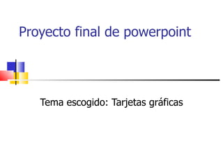Este documento trata sobre tarjetas gráficas. Explica que son placas que procesan datos de la CPU para mostrarlos en pantalla, historia desde los 60 y tipos como GPU. Describe fabricantes como Nvidia y AMD, usos como gaming, y efectos como antialiasing. Explica también refrigeración, alimentación, overclocking y rendimiento. Por último, compara tecnologías SLI de Nvidia y Crossfire de AMD.