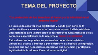Este documento resume un proyecto sobre la protección de los derechos al honor y la intimidad en el entorno digital. El proyecto tiene como objetivos promover la conciencia sobre estos derechos, estudiar casos reales, analizar medidas de prevención, buscar sentencias relevantes y legislación aplicable en España. El documento explica los derechos al honor, intimidad y protección de datos personales, y concluye que son derechos fundamentales protegidos por la Constitución española y otras leyes.