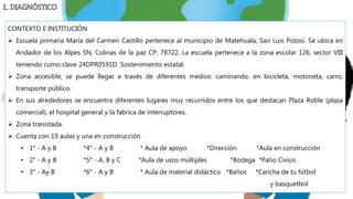 El documento proporciona información sobre un curso de diagnóstico e intervención socioeducativa en una escuela primaria en Matehuala, San Luis Potosí. Describe la escuela, incluyendo su contexto, infraestructura, personal, horario y matrícula. También describe las aulas de diferentes grados, incluyendo materiales, alumnos y desafíos específicos. El objetivo es mejorar la conciencia ambiental de los estudiantes y promover una escuela más limpia.