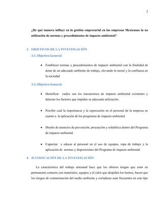 Este documento describe un estudio sobre la falta de normas y procedimientos de impacto ambiental en las empresas mexicanas y cómo esto afecta su gestión. El objetivo es establecer dichas normas para mejorar el ambiente laboral, aumentar la moral y la confianza pública. Se plantea la hipótesis de que aplicando un programa de impacto ambiental mejorará la moral, la confianza y el rendimiento de los trabajadores. El método será inductivo utilizando encuestas, entrevistas y revisión bibliográfica.