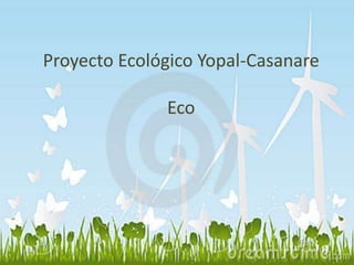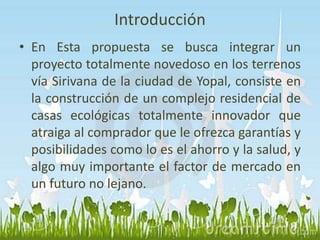 Este documento presenta un proyecto ecológico de viviendas en Yopal, Casanare, Colombia. El proyecto consiste en la construcción de un complejo residencial de casas ecológicas e innovadoras en un terreno de 74,608 metros cuadrados, con zonas verdes, senderos, y energía renovable. El documento describe los diseños de las casas, techos y paredes verdes, y los beneficios ambientales, económicos y de salud del proyecto.