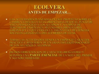 El documento presenta una lista de actividades prácticas para estudiantes de secundaria sobre el cambio climático. Las actividades incluyen separar la basura en casa, reciclar pilas y bombillas, medir variables climáticas, crear un manifiesto sobre el cambio climático, y dar consejos para ahorrar energía en el hogar y en la conducción de vehículos. El objetivo es crear conciencia sobre cómo las acciones individuales pueden contribuir a mitigar el cambio climático.