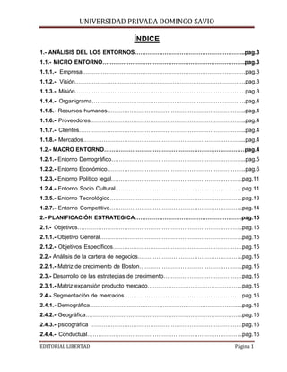 El documento presenta el plan de marketing de la Editorial Libertad. Incluye un análisis del entorno interno y externo de la empresa, así como su estrategia comercial. En el análisis de entorno se describe la situación demográfica, económica y sociocultural de Santa Cruz, Bolivia. La estrategia comercial incluye objetivos, segmentación del mercado, estrategias de producto, distribución, comunicación y precios. El plan busca posicionar a la editorial como líder en el mercado infantil de Santa Cruz.