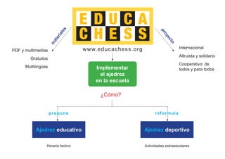 Este documento propone implementar el ajedrez en las escuelas como recurso educativo transversal que puede mejorar el aprendizaje en distintas áreas. Explica que el ajedrez desarrolla múltiples inteligencias y cómo puede integrarse en el horario lectivo sin coste a través de proyectos dirigidos por el profesorado. También ofrece materiales didácticos gratuitos para alumnos y formación para profesores.