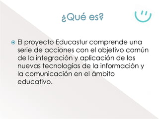 El proyecto Educastur tiene como objetivo principal integrar y aplicar las nuevas tecnologías de la información y comunicación en el ámbito educativo de Asturias. Para lograr esto, se creará una red telemática educativa, se fomentará el uso de las TIC en la enseñanza, y se dotará a los centros educativos de la infraestructura y recursos tecnológicos necesarios. Educastur también ofrecerá formación del profesorado, servicios en línea para docentes y estudiantes, y comunidades virtuales educativas