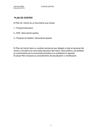 El documento presenta el Plan de Centro del CEIP Alfares. Explica que el Plan incluye el Proyecto Educativo, el Reglamento de Organización y Funcionamiento y el Proyecto de Gestión. Detalla los objetivos y líneas de actuación pedagógica del Proyecto Educativo, incluyendo la mejora de la competencia lingüística, la atención a la diversidad y la promoción de hábitos saludables. También describe el entorno, los espacios y el alumnado del centro.