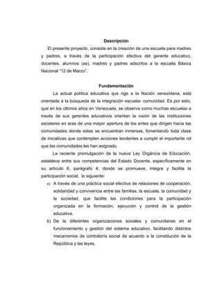 Este documento describe un proyecto para crear una escuela para madres y padres en la Escuela Básica Nacional "12 de Marzo" en Venezuela. El proyecto busca mejorar la integración entre la escuela y la comunidad a través de talleres y programas para padres, con el objetivo de elevar el rendimiento académico de los estudiantes. La escuela para padres se establecería en las instalaciones de la Escuela Básica Nacional durante un período de dos meses para integrar a los padres en el proceso educativo de sus hijos.