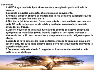 Este documento proporciona instrucciones sobre cómo plantar y cuidar árboles. Explica los pasos para plantar un árbol correctamente, incluido llenar el hoyo con tierra y regarlo. También recomienda usar una cobertura vegetal alrededor del árbol y un programa de riego regular para mantener la red de raíces húmeda. Además, proporciona pautas para abonar y podar el árbol para promover un crecimiento saludable a lo largo de los años.