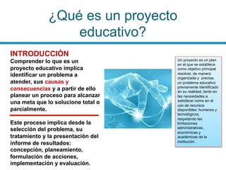 El documento describe los componentes clave de un proyecto educativo, incluyendo la identificación de un problema, los objetivos, las etapas de planificación, implementación y evaluación. Un proyecto educativo busca resolver un problema educativo mediante un plan organizado que asigna recursos y responsabilidades para alcanzar los objetivos planteados.