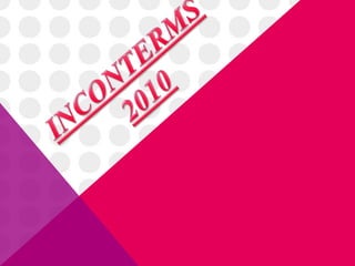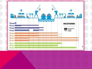 Los Incoterms definen las responsabilidades del comprador y vendedor en la entrega de bienes. Existen 11 términos que abrevian en 3 letras cada uno y cubren diferentes modos de transporte. Cada término especifica en qué punto se transfieren los riesgos y costos entre comprador y vendedor. Por ejemplo, EXW significa que el vendedor solo es responsable de poner los bienes a disposición del comprador, mientras que CIF significa que el vendedor se hace cargo del costo, seguro y flete hasta el puerto de destino acordado