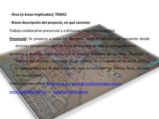 Este proyecto educativo propone trabajar sobre educación vial de forma presencial y a distancia. Presencialmente, invitará a especialistas a dar charlas a los estudiantes y ellos realizarán investigaciones y producciones como videos y presentaciones sobre el tema. A distancia, compartirán sus trabajos en Facebook y debatirán generando propuestas entre escuelas que presentarán a las autoridades de tránsito. El objetivo es promover valores como la vida y la responsabilidad vial.