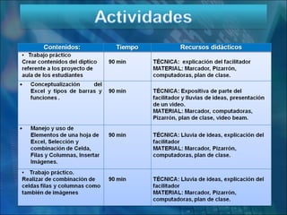 El documento propone estrategias para fortalecer la creatividad de los docentes del liceo técnico Teniente Pedro Camejo mediante el uso de tecnologías de la información y la comunicación (TIC). Se busca capacitar a los docentes en el uso básico de computadoras y herramientas de Office, así como fomentar el desarrollo integral de los estudiantes y la comunidad. La iniciativa responde a la necesidad de adaptarse a las demandas tecnológicas actuales y contribuir al mejoramiento de la calidad educativa en el país.