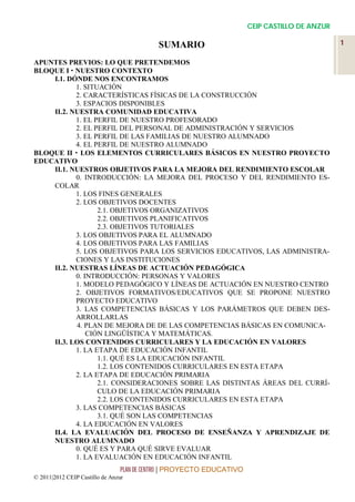 Este documento presenta el plan de centro y proyecto educativo del CEIP Castillo de Anzur. Describe el contexto del colegio incluyendo su ubicación, instalaciones y perfil de la comunidad educativa. También detalla los elementos curriculares básicos como objetivos, líneas de actuación pedagógica, contenidos, evaluación y organización del tiempo. Por último, incluye planes para atender a la diversidad, reforzar aprendizajes y fomentar la convivencia.