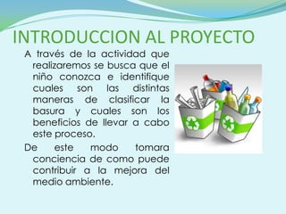 Este documento presenta un proyecto para enseñar a los niños sobre el reciclaje y la clasificación de basura. El proyecto les dará a los niños materiales inservibles para que identifiquen y separen los diferentes tipos de basura orgánica e inorgánica. El objetivo es que los niños entiendan los beneficios del reciclaje y cómo pueden ayudar al medio ambiente.