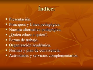 El documento presenta el proyecto educativo del Centro Escolar Amanecer, un colegio privado. Describe su filosofía basada en una educación personalizada, activa y centrada en el desarrollo integral del estudiante. Detalla su enfoque metodológico participativo y su énfasis en el trabajo en equipo, el pensamiento crítico, la creatividad y los valores. También explica su organización académica, las actividades complementarias y la importancia de la acción tutorial.
