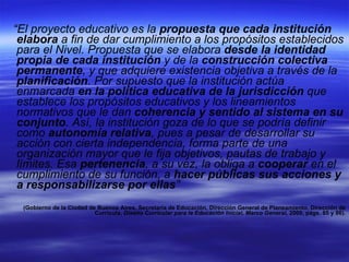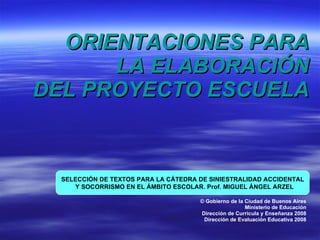 El documento presenta las orientaciones para la elaboración del Proyecto Escuela. Explica que el Proyecto Educativo es la propuesta de cada institución para cumplir con los objetivos del nivel educativo, elaborada de forma colectiva y enmarcada en la política educativa jurisdiccional. Detalla las 5 etapas para construir el Proyecto Escuela: 1) identificación de problemas, 2) diagnóstico focalizado, 3) definición de líneas de acción, 4) construcción de viabilidad y 5) seguimiento y evaluación.