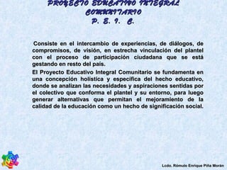El documento describe el Proyecto Educativo Integral Comunitario (PEIC), el cual busca mejorar la calidad de la educación a través de un enfoque holístico e integral que involucra a la comunidad escolar y su entorno. El PEIC implica analizar las necesidades de la escuela y su contexto, formular objetivos y acciones pedagógicas, culturales y sociales, y establecer compromisos y mecanismos de evaluación para lograr una educación diversificada y de calidad para todos.