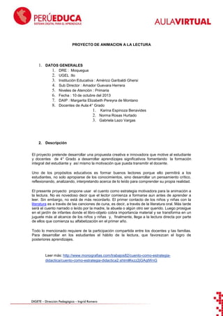 Este documento presenta un proyecto de animación a la lectura llamado "Mis cuentos favoritos" para docentes de 4° grado en la Institución Educativa Américo Garibaldi Ghersi en Ilo, Perú. El proyecto tiene como objetivo principal aplicar el cuento como estrategia para mejorar el rendimiento académico en comunicación. Las actividades incluyen crear cuentos usando personajes de su entorno, tomar fotografías para ilustrar los cuentos, producir diálogos entre los personajes, y compartir las producciones