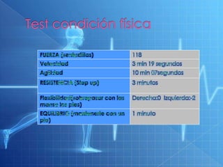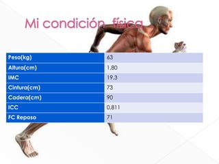 Este documento presenta los datos antropométricos y de flexibilidad articular de un paciente. Muestra sus medidas de peso, altura, IMC, circunferencias de cintura y cadera e índice de cintura-cadera. Evaluó 19 movimientos articulares de ambos lados del cuerpo. Recomienda ejercicios para mejorar la flexibilidad de rodillas, caderas y hombros, así como para fortalecer los trapecios y aumentar la resistencia general con carrera continua de baja a moderada intensidad.