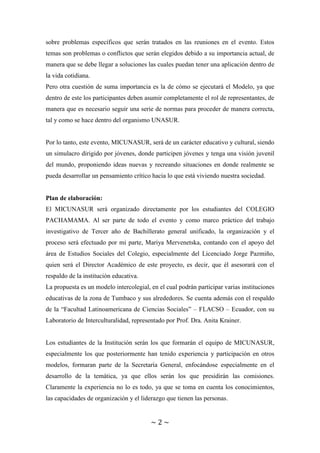 Este documento describe el Modelo Intercolegial Unión de Naciones Suramericanas (MICUNASUR) de 2014. MICUNASUR es un evento educativo que simula las estructuras y procesos de la UNASUR, donde estudiantes asumen roles de representantes y debaten temas importantes de la región. El documento explica la justificación, objetivos, estructura, temática y proceso de organización de MICUNASUR, el cual será organizado por estudiantes del Colegio Pachamama y contará con el apoyo de FLACSO.