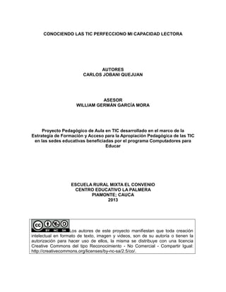 Este documento describe un proyecto de aula desarrollado en la Escuela Rural Mixta El Convenio en Piamonte, Cauca, Colombia. El proyecto buscaba mejorar la comprensión lectora de los estudiantes de tercer grado utilizando herramientas TIC. Incluía actividades como crear cuentos y fabulas usando programas como Edilim, desarrollar presentaciones en PowerPoint sobre hábitos de lectura, y realizar seguimiento del progreso a través de escritos en Word. El proyecto logró motivar a