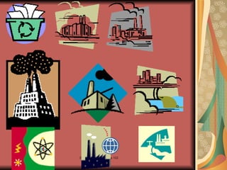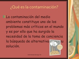 El documento discute los problemas del deterioro ambiental y la contaminación, explicando que afectan a todo el planeta y requieren una acción global. Identifica algunos problemas específicos como la destrucción de la capa de ozono, el cambio climático, la lluvia ácida y la pérdida de biodiversidad. También incluye un esquema sobre la contaminación por automóviles y algunas imágenes relacionadas con el medio ambiente y la contaminación.