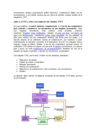 El documento explica la historia y el funcionamiento de las máquinas controladas numéricamente (CNC). Las máquinas CNC se utilizan ampliamente en la industria para automatizar procesos de fabricación como mecanizado. Consisten en un controlador, motores, un sistema de realimentación y una interfaz de usuario. El controlador ejecuta programas que controlan los movimientos precisos de las herramientas de corte a lo largo de los ejes coordinados de la máquina. Arduino puede usarse para crear máquinas CNC caseras controlando motores paso a
