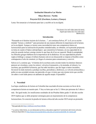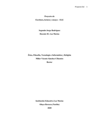 Este documento presenta el Proyecto ELE (Escritura, Lectura y Ensayo) de la Institución Educativa Las Marías, con el objetivo de motivar la lectoescritura entre los estudiantes. El proyecto busca proponer estrategias para mejorar los bajos resultados en pruebas de lectura y establecer una política institucional de lectura. Se justifica la importancia de desarrollar habilidades lectoras y escritoras para el desempeño académico y la vida cotidiana. El marco conceptual analiza los procesos