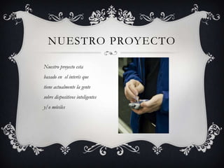 El proyecto busca crear una aplicación móvil gratuita llamada Free Apps que tenga como objetivo dar a conocer la importancia de las aplicaciones móviles y seguir los pasos de Steve Jobs en el mercado tecnológico. El proyecto será desarrollado por dos estudiantes en un periodo de 2 a 5 meses utilizando herramientas como App Inventor y recursos como computadores con Windows 7 y acceso a Internet.