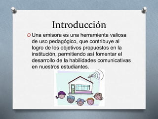 Este documento presenta un proyecto para establecer una emisora escolar con el objetivo general de utilizarla como herramienta pedagógica. Los objetivos específicos son formar semilleros de comunicadores e integrar a toda la comunidad educativa alrededor de la emisora. A corto plazo, se formarán equipos de trabajo con funciones definidas y orientación pedagógica, mientras que a largo plazo se integrará a la institución y comunidad a través de redes. La emisora permitirá desarrollar hab