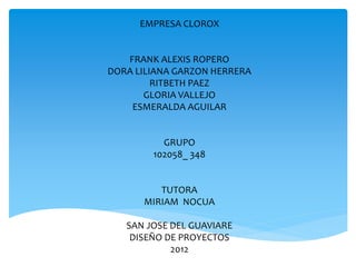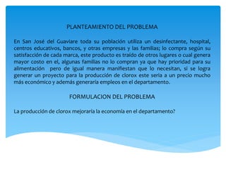 Este documento propone crear una empresa para producir y comercializar un desinfectante llamado CLORIXSOL en San José del Guaviare, Colombia. El proyecto justifica la creación de la empresa debido a que el producto sería económico y de alta demanda por la población. El objetivo es distribuir 18 millones de mililitros anuales en el departamento de Guaviare y parte del departamento del Meta, generando empleos y fortaleciendo la economía local. Se realizó un estudio de mercado que muestra la viabilidad del proyecto.