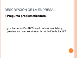 La barbería Johan's S.A. ofrece servicios de corte de cabello y depilación en Itagüí. La empresa fue fundada en 2013 y actualmente cuenta con 11 empleados, incluyendo 8 barberos. La misión de la empresa es satisfacer las necesidades de imagen de los clientes con altos estándares de calidad y servicio. La barbería utiliza estrategias de mercadeo como publicidad en televisión, radio y volantes para darse a conocer en la localidad.